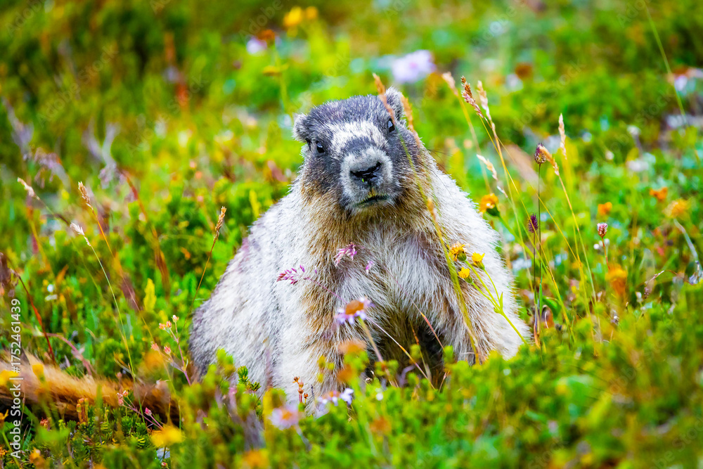 Cute Hoary Marmot portrait in Glacier National Park surrounded by flowers