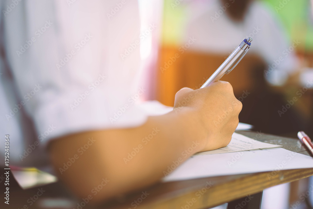 Closeup to hand of student holding pen and taking exam in classroom with stress for education test