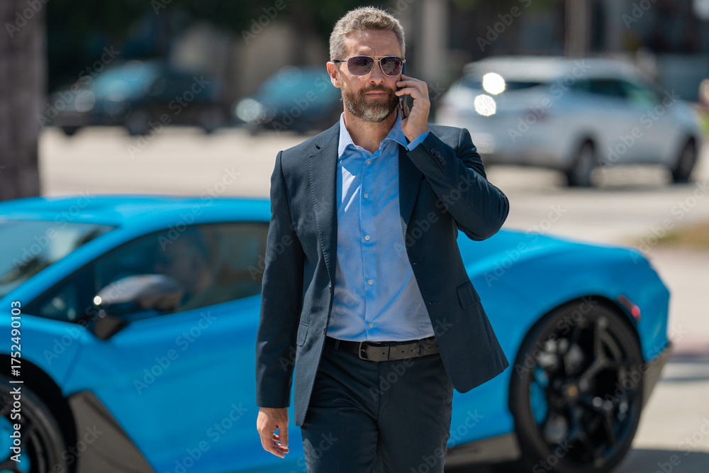 Rich business man near luxury car. Success businessman. Mature rich business man in stylish jacket. Rich business man in suit walking outdoor. Luxury successful business man.