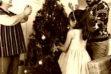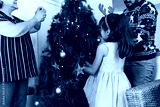 Latin Family with little girl or father and daughter with grandparents decorating christmas tree at home in mexico Latin America, hispanic people in holidays