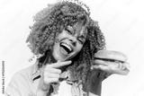 Cheerful young woman with curly hair holding a delicious hamburger against a bright white background, showcasing joy and enthusiasm for healthy eating
