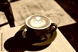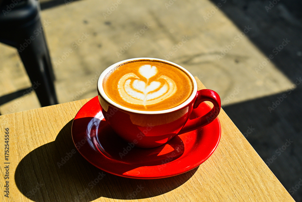 Close up view of hot cafe latte on the cornerwooden table. red cup or mug. art. brown. dark, black, shadows. morning. relax, coffee time. cafe. coffee shop. sun shine, light. ceramic.