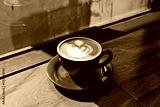 Close up view of hot cafe latte on the wooden table. red cup or mug. art. brown. dark, black, shadows. morning. relax, coffee time. cafe. coffee shop. sun shine, light. ceramic.