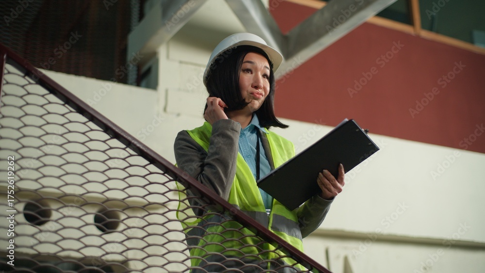 Asian Korean woman checking building plan read checklist chart construction project female builder engineer inspector Chinese Japanese girl smiling architect in hard hat document paperwork developer