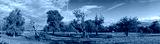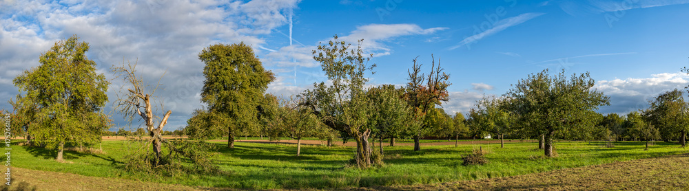 Panoramafoto einer idyllischen, menschenleeren Streuobstwiese mit in vollem Laub stehenden Apfelbäumen im warmen Nachmittagslicht der Herbstsonne