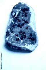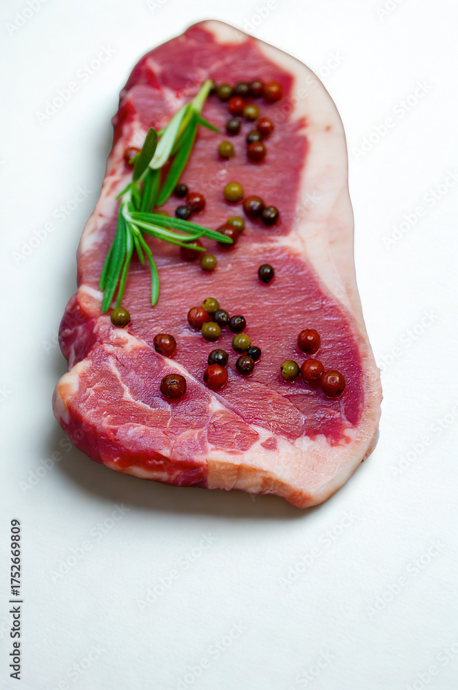 Raw steak seasoned with peppercorns and rosemary ready for cooking
