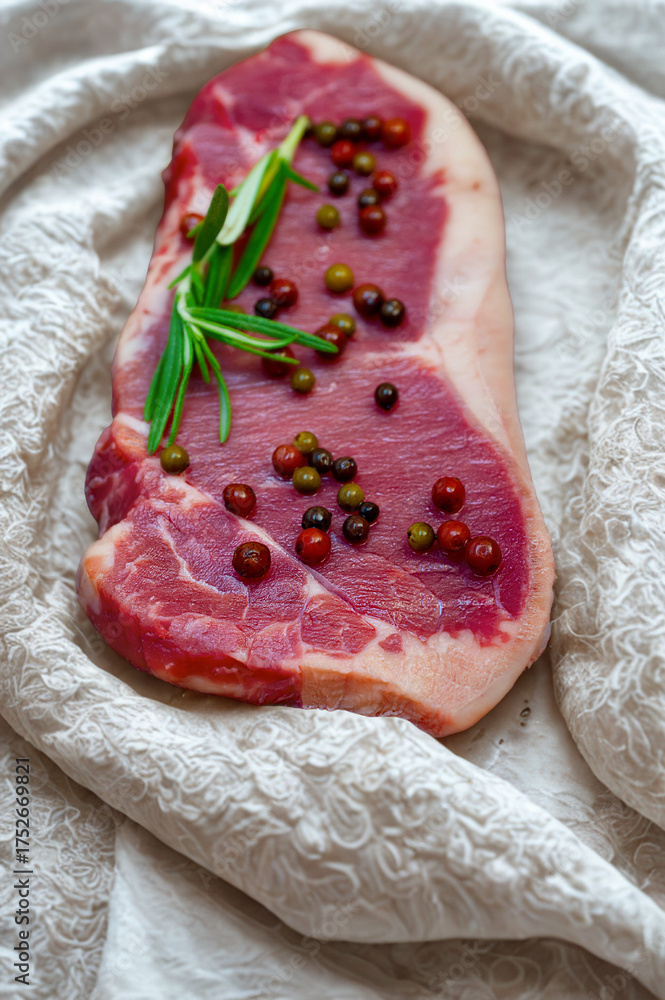 Raw t bone steak seasoned with peppercorns and rosemary on a textured fabric