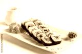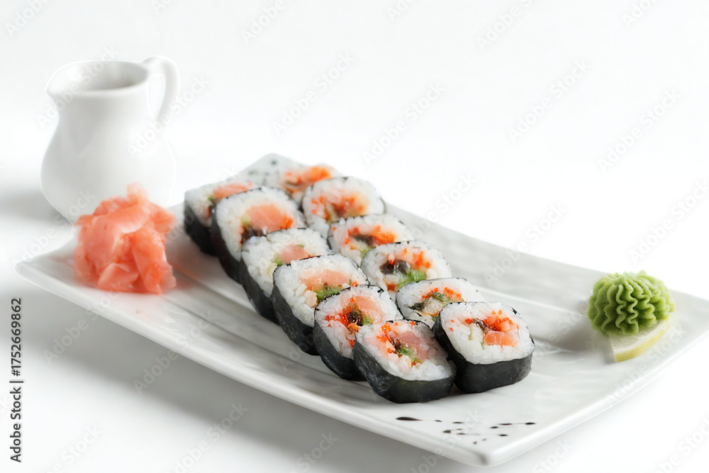 Delicious sushi rolls arranged on a white plate with accompaniments