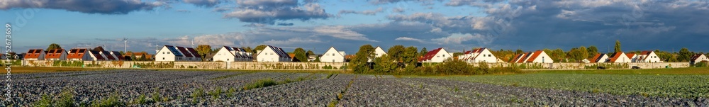 Panoramafoto der Gebäude einer Einfamilien-Reihenhaussiedlung mit Schallschutzwand und einem Feld im Vordergrund im warmen Nachmittagslicht der Herbstsonne