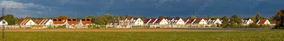 Panoramafoto der Gebäude einer Einfamilien-Reihenhaussiedlung mit Schallschutzwand und einem Feld im Vordergrund im warmen Nachmittagslicht der Herbstsonne