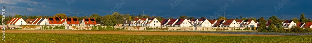 Panoramafoto der Gebäude einer Einfamilien-Reihenhaussiedlung mit Schallschutzwand und einem Feld im Vordergrund im warmen Nachmittagslicht der Herbstsonne