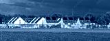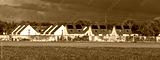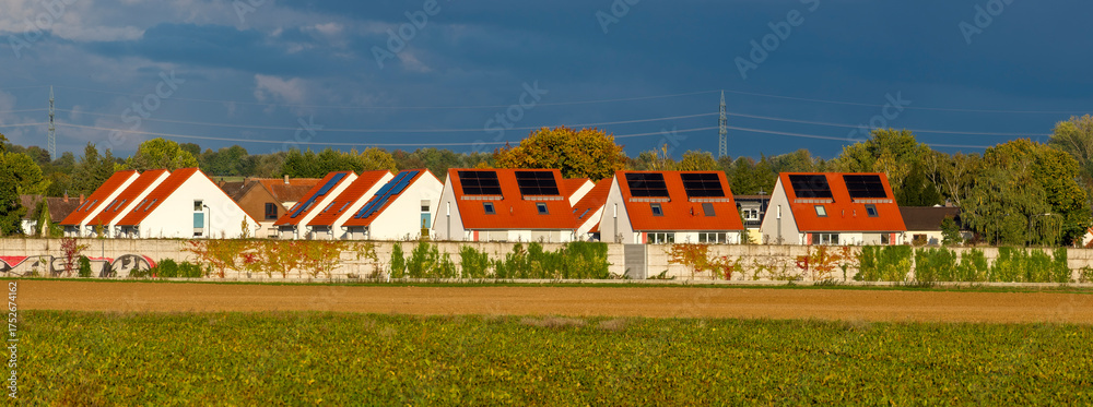 Panoramafoto der Gebäude einer Einfamilien-Reihenhaussiedlung mit Schallschutzwand und einem Feld im Vordergrund im warmen Nachmittagslicht der Herbstsonne