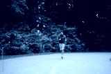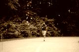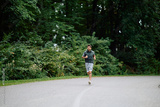 Young man exercising outdoors, running on an asphalt road surrounded by green trees. Focusing on health and active lifestyle
