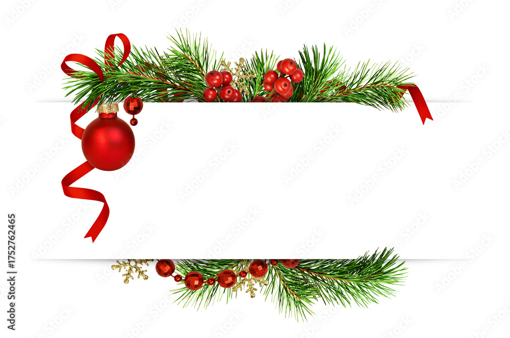 Decorative green twigs of Chrismas tree and red decorations with empty space for text isolated on white or transparent background