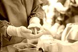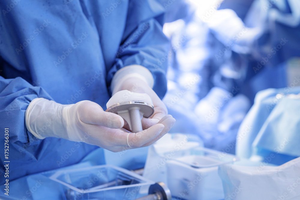 Knee replacement implant held by clinician during orthopedic arthroplasty in sterile theatre