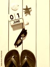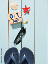 Beach accessories celebrating the first day of summer on a light blue wooden background