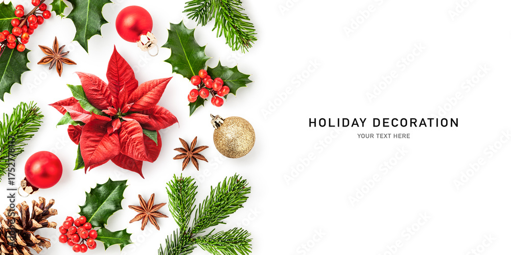Christmas borders with red poinsettia and holly. Flat lay photography isolated on white background