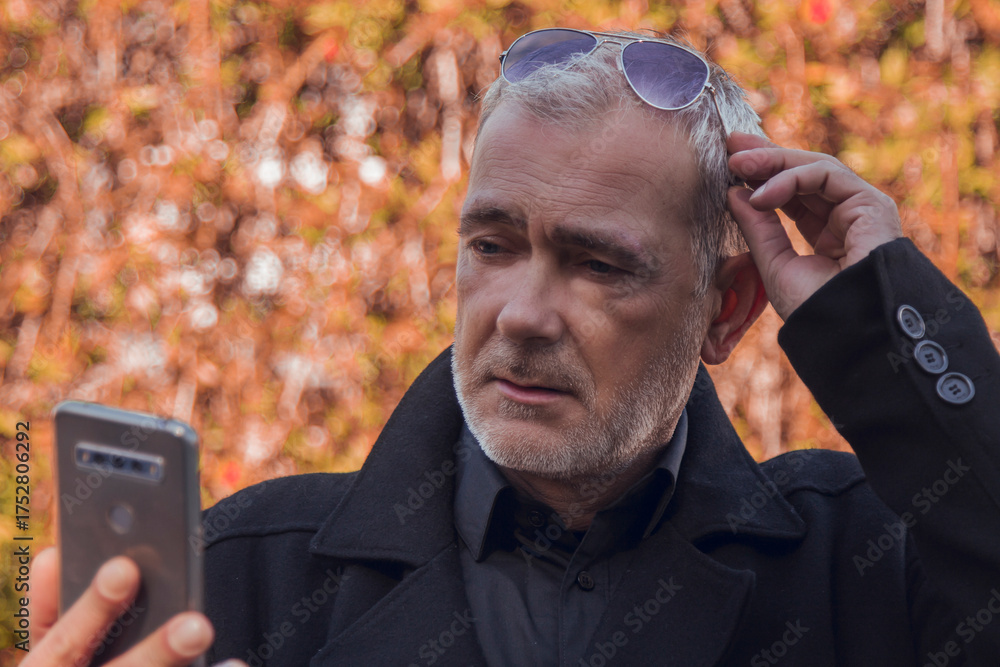 mature man looking at mobile phone with autumn background
