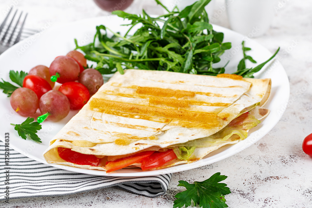 A healthy breakfast. Lavash with cheese, tomatoes, and herbs. Fresh salad.