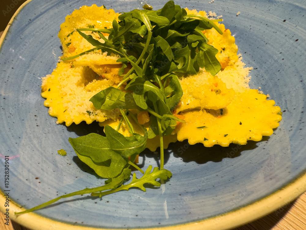 Delicious ravioli dish garnished with arugula and cheese on blue plate
