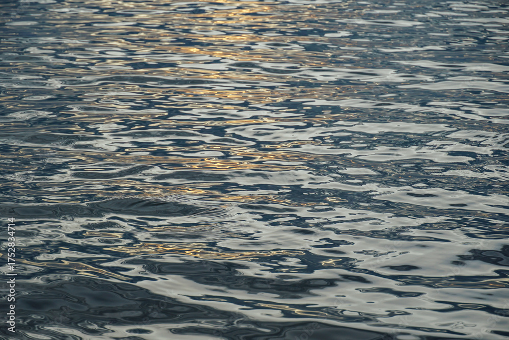 Water ripple surface texture, Rippling water surface with sunset reflection ripples. Golden sunset on rippling ocean waves. Tranquil water ripples reflecting sunlight.