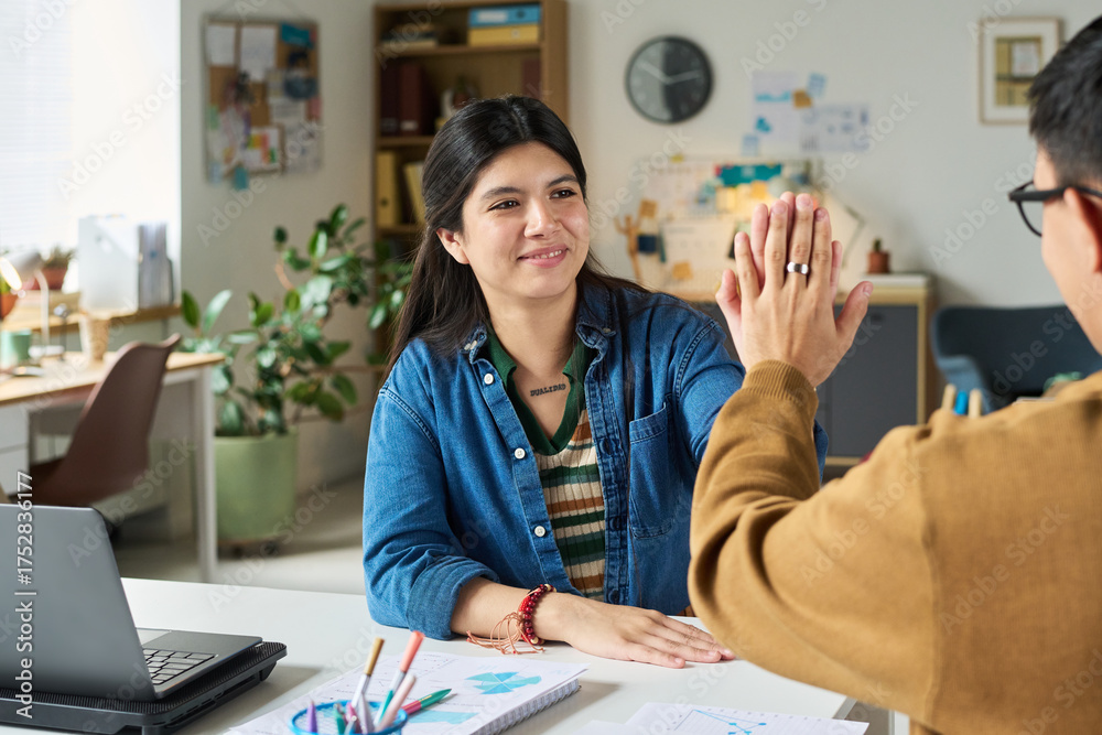 Hispanic woman smiling while giving high five to unseen across desk in modern office setting, laptop and documents visible on table, casual business interaction