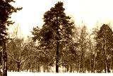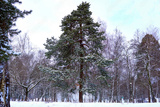 Peace,silence.Green pine tree covered with snow,cloudy sky