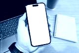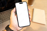 Hand Holding Smartphone with Blank White Screen at Workspace. a modern and minimalistic office or work from home environment.