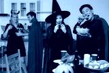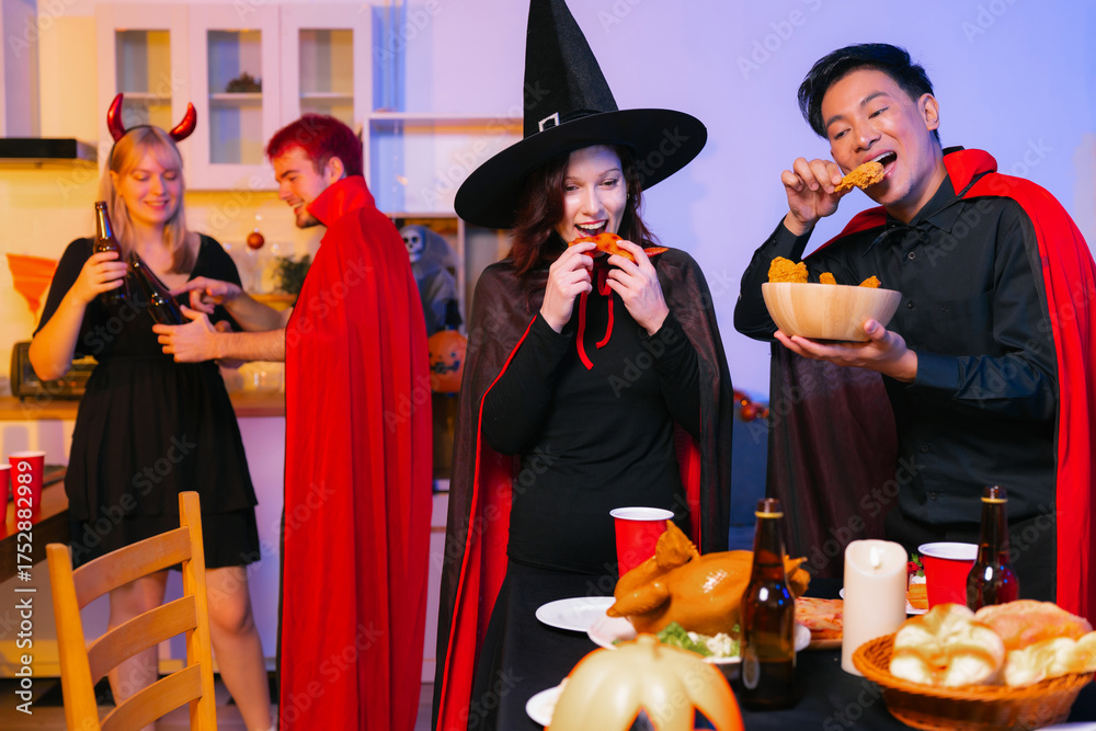 Dinner and group of people celebrating together at Halloween party.