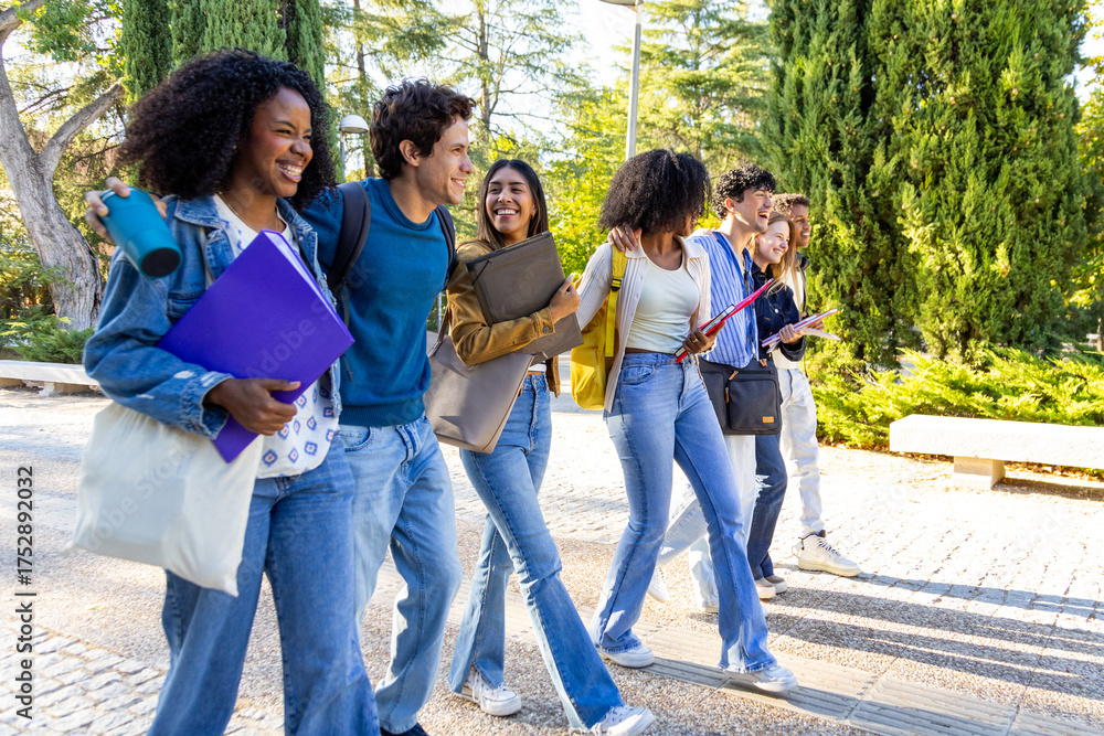 Diverse students walking and laughing on campus path