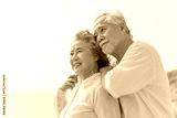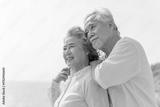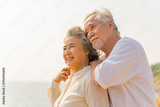 Happy Asian family senior couple enjoy outdoor lifestyle travel nature ocean relaxing together at tropical island beach on summer holiday vacation. Elderly people healthcare and wellness concept.