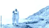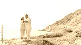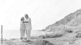 Happy Asian family senior couple dancing together on coastline at sunset. Healthy elderly husband and wife enjoy outdoor lifestyle travel nature at the sea in summer. Old people mental health wellness