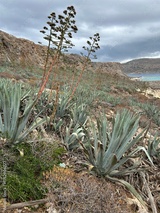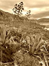 duże kwitnące agawy na zboczu góry