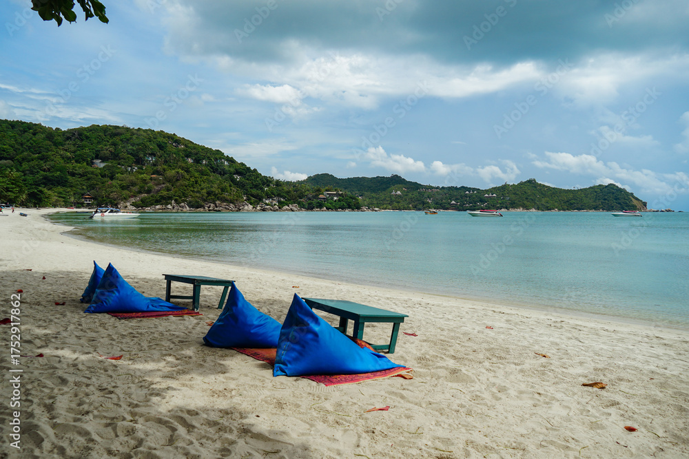 Relaxing beach scene with beach umbrella shading comfortable beds , cabana, water, sunshade. Beautiful beach and white sand with beach chair. Asian tropical beach paradise in Thailand