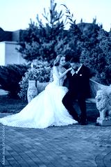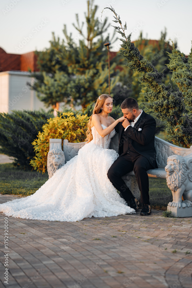 Gentle and happy bride and groom at sunset in the park on a bench.