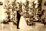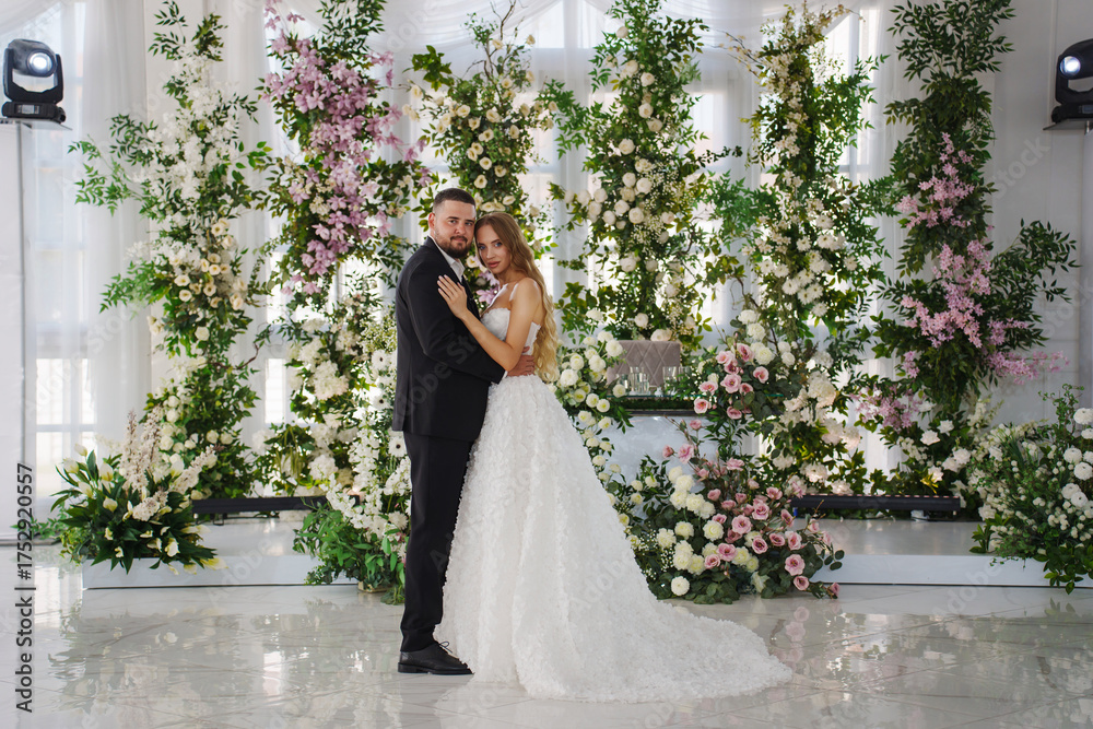 The bride and groom in front of the table in banquet hall decorated with flowers