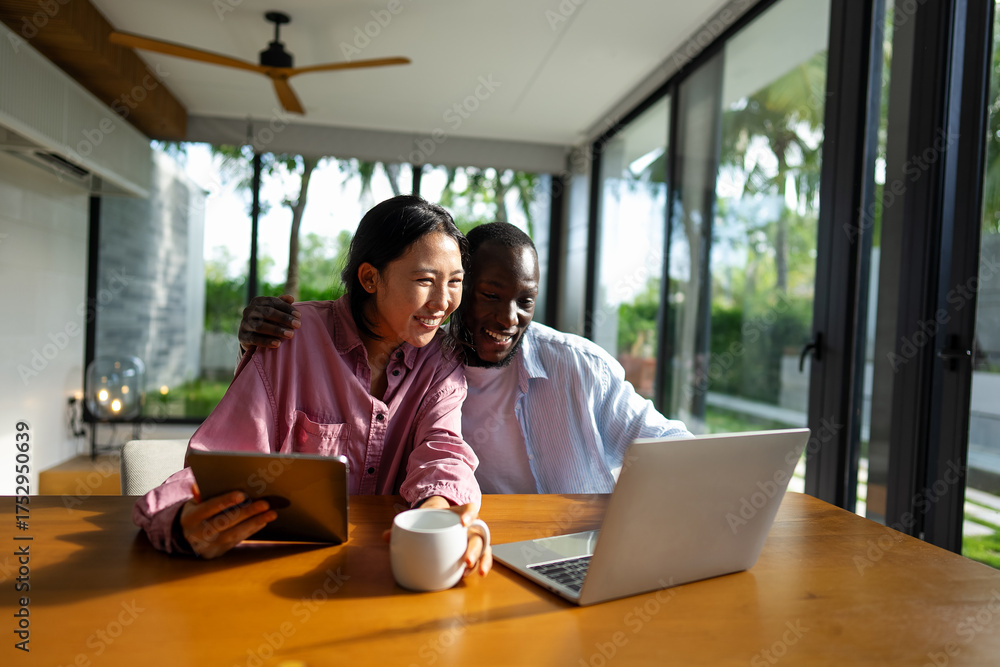 A happy, multi-national couple who are digital nomads and work from a different country every month