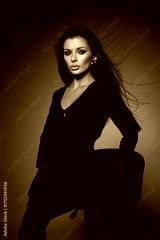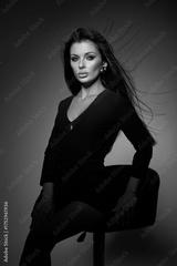 woman with long dark hair sits elegantly on a stool in a studio. lighting accentuates her features, creating a dramatic atmosphere. She gazes directly at the camera, showcasing her style