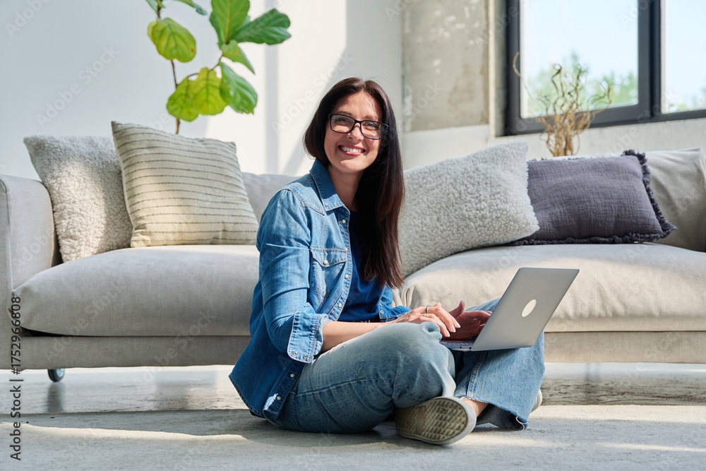 Portrait of young beautiful positive woman with laptop sitting at home