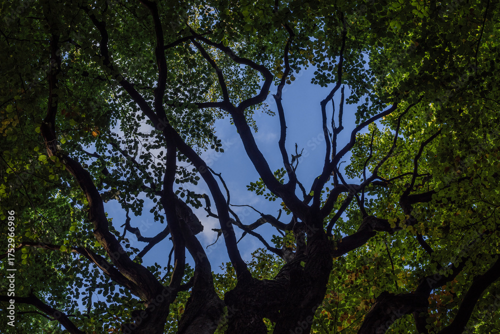 FOREST LANDSCAPES - Beech tree crowns against the blue sky