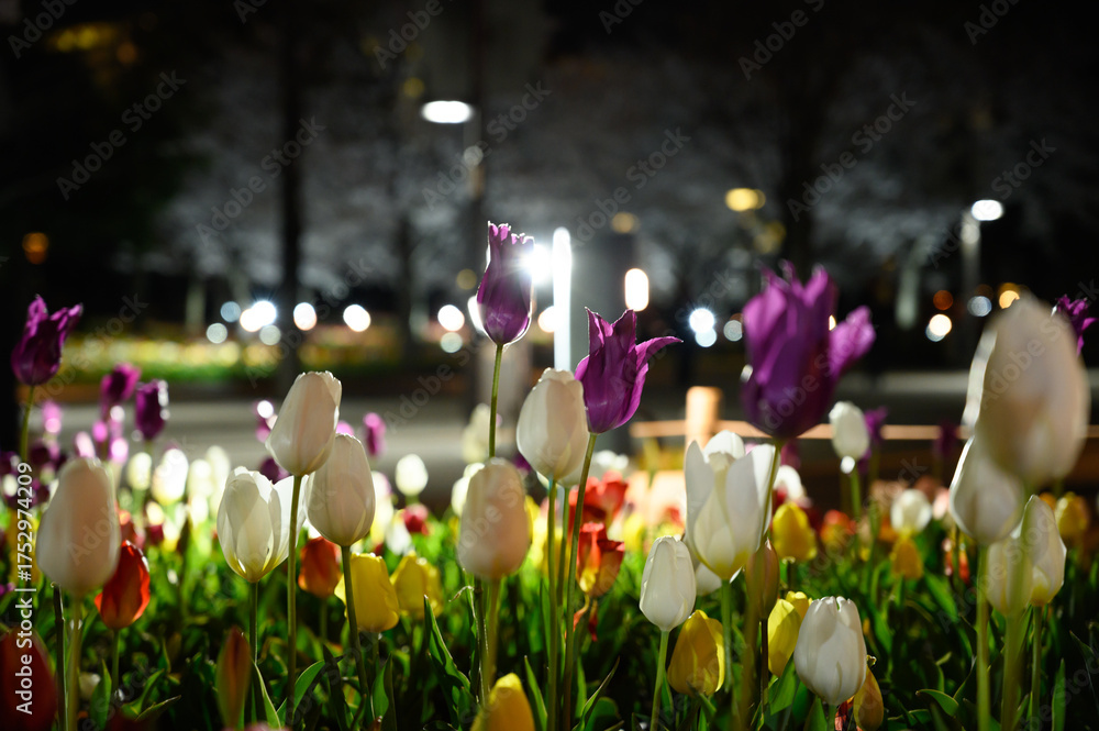 Beautifully blooming tulip flowers in a flower garden at night in Odaiba. Spring blossom background..