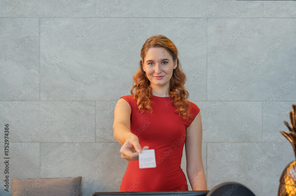 Female receptionist giving key card while standing at counter in hotel lobby.