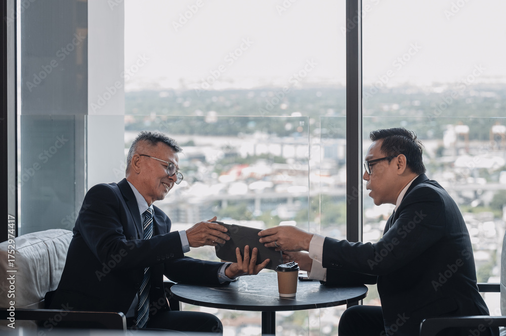 Two senior businessmen discussing information on a digital tablet during a professional meeting in a modern office with city view.