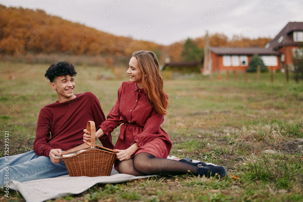 A genuine couple sharing a relaxed outdoor picnic on a grassy field, capturing authentic interaction and natural smiles as they enjoy a warm autumn afternoon together with a wicker basket,
