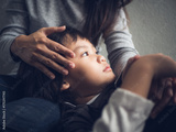 Closeup sad little boy lying by his mother at home. Parenthood, Love and togetherness concept.