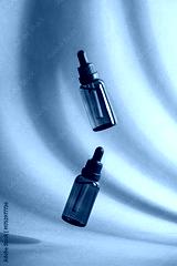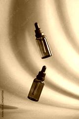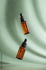 Two amber dropper bottles with beauty serum floating in the air in sunlight on a green background with shadows.