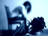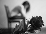 Sad woman sitting and crying with red rose in focus. Lonly , love, emotion concept.