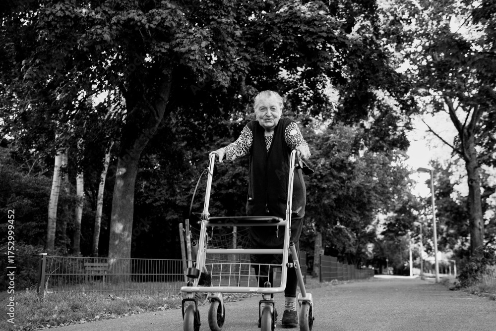 Elderly woman with happy smile taking a walk through the park with help of walker
