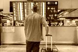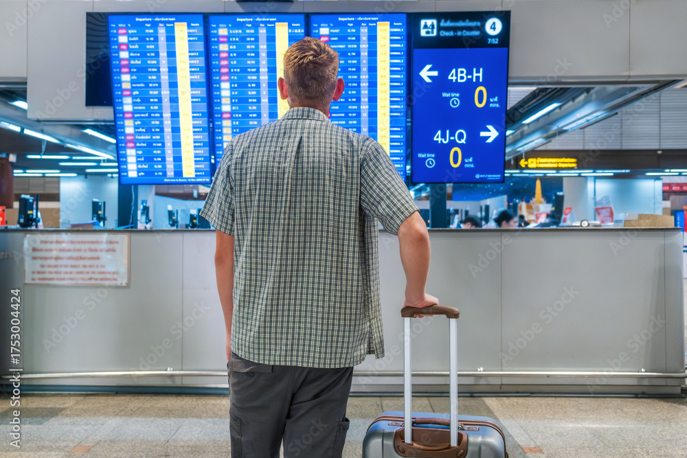 Man traveler with suitcase checking flight departure screen at airport terminal before check-in. Male tourist standing in front of flight schedule board in airport. Modern travel, global mobility