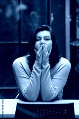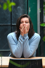 Natural light portrait of a mid-adult woman sitting at an outdoor café table, thoughtful expression and calm mood, casual sweater, authentic candid moment with soft background and natural color tones.